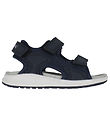 Smart Viking sandals in navy textile and imitation leather, and on one strap "Viking" is written in white. The outer soles are white and navy.