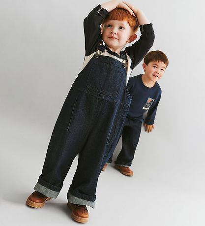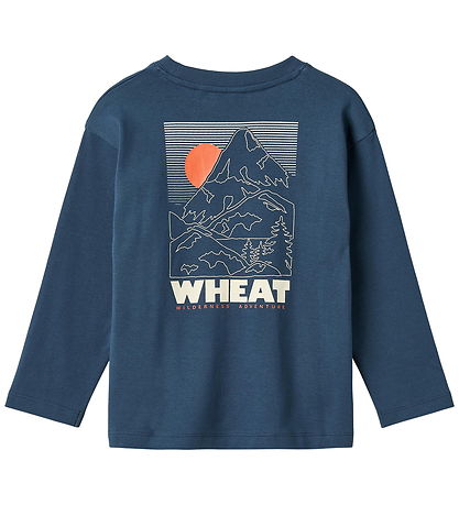Smart Wheat blouse in dark blue with a print on the left chest of a mountain landscape and the text "Wheat Wilderness Adventure" in white and orange. On the back is the same print in a large version. The Blouse has a round neckline with a narrow ribbed edge and long sleeves.