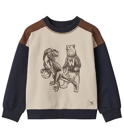 Beautiful Wheat sweatshirt in a light beige shade with a fun dinosaur and bear print on the front. The Sweatshirt has long sleeves and contrasting colors on the shoulders, giving it a trendy look.