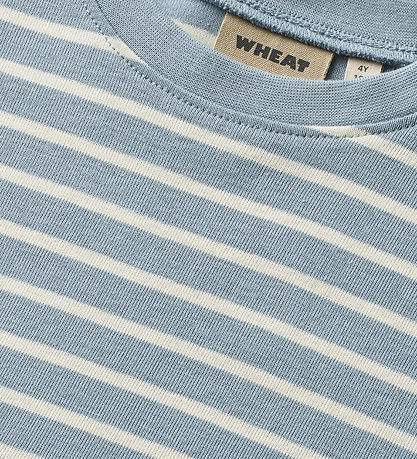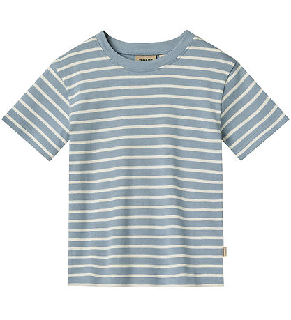 Smart Wheat t-shirt in dusty blue with white, horizontal stripes.