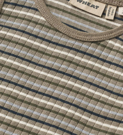 Beautiful Wheat underwear consisting of an undershirt and a pair of boxers with ribbed structure and in a classic striped design in different shades of beige, green and blue.