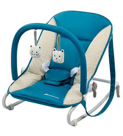 The Bebeconfort bouncer has a 3-point harness that fits the baby. The chair has a quilted bow with two fun toys, and the arch can be removed if desired.
