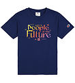 Cool Champion Fashion t-shirt in navy, with "Champion" embroidered in navy, white and red both on the front left chest and a logo embroidered in the same colours on the left sleeve.