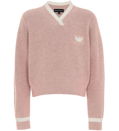 Elegant Emporio Armani blouse in a soft, pink shade. The Blouse has long sleeves and a V- throat with contrasting edges that add a modern touch. On the chest there is a discreet Emporio Armani logo that emphasizes the style. Ribbed cuffs and edge give the blouse a classic look. The blouse is made of a soft, knitted quality with a nice rib structure.