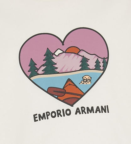 Beautiful blouse from Emporio Armani with long sleeves in a light cream color. On the front you can see a pink motif of a heart, which contains a landscape with mountains, trees and a sun in the background. The details are highlighted by bright shades such as purple, blue and brown as well as a discreet logo at the bottom. The Emporio Armani name is written below the motif in a distinctive black font.