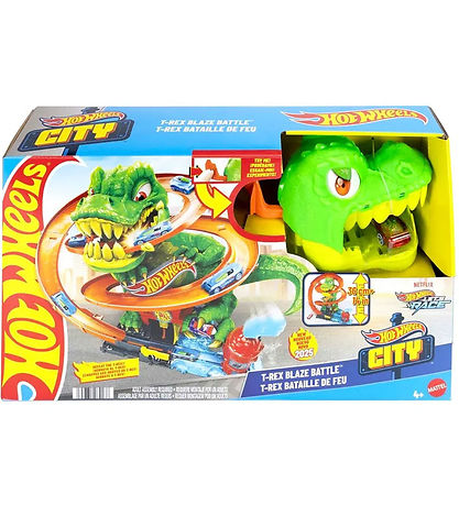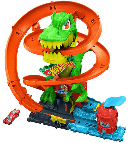 Dangerous and fun Hot Wheels car track with a lively T-Rex that delivers action and fun and a race car. The car track includes a unique bow with challenges for the cars that will engage and entertain for hours.