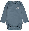The Hummel bodysuit has long sleeves and a round throat that opens with push buttons in the left shoulder. The Bodysuit also has push buttons between the legs, and both the throat and the leg openings have narrow ribbed edges. The Bodysuit is in a stretchable cotton quality.