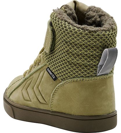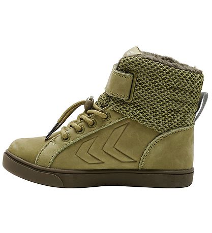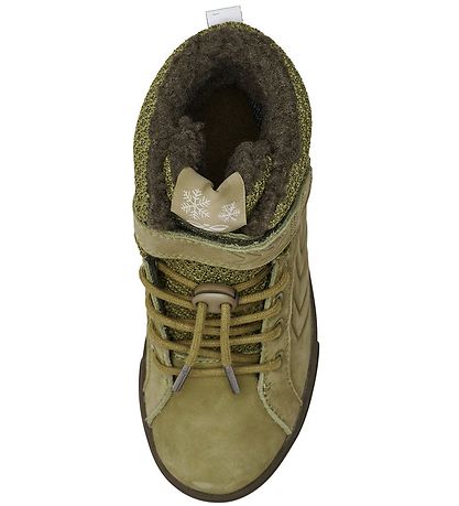 Smart Hummel winter boots in green suede and textile. On the inside and outside there are two classic shevrons, and on the tongue there is a white logo print.