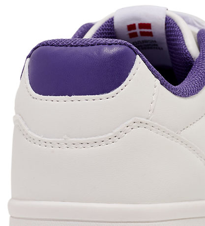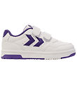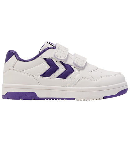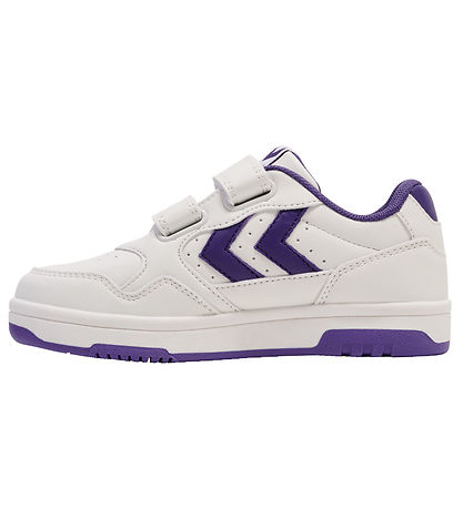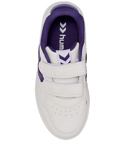 Smart Hummel shoe in white, imitation leather with purple details and Hummel shevrons in purple.