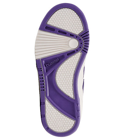 The shoes have a purple and white outer sole and under the bottom there is a Hummel pattern, which ensures a good foothold.