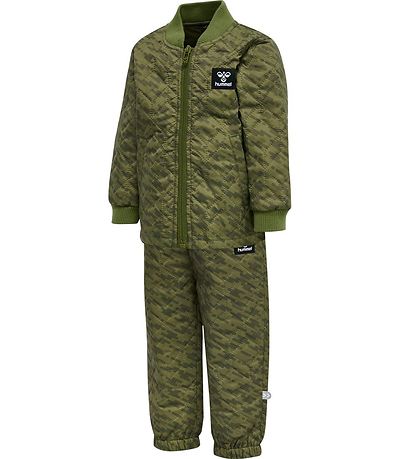 lovely Hummel thermo set with a bold all-over pattern of dark and light shades of army green and with a nice embossed pattern of dots, which gives a beautiful structure. On the left chest and the left side of the trousers there is a black mark with the logo in white.