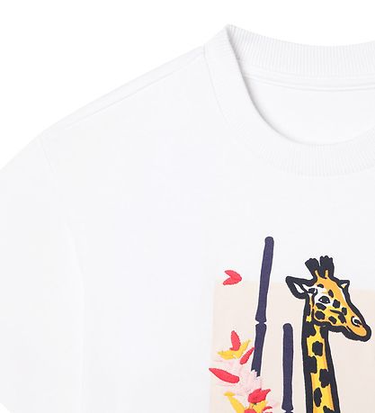 Beautiful Kenzo dress in white with a large print on the front with a yellow giraffe with black details on a pink powder background. Flowers are printed all around in pink and green and with embroidered details in yellow and red.
