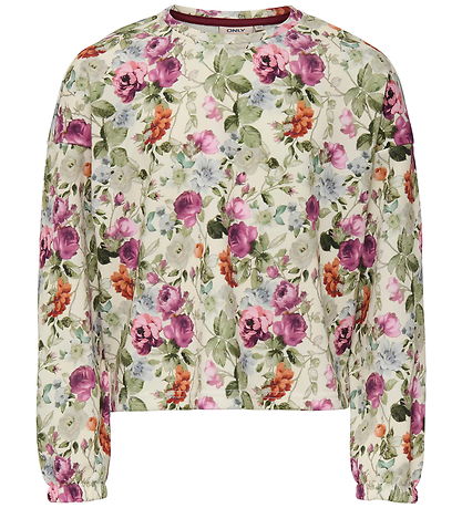 Elegant Kids Only sweatshirt in beige with a beautiful floral print in purple, orange and green shades. The Kids Only sweatshirt has a round neckline and long sleeves with elastic at the wrists.