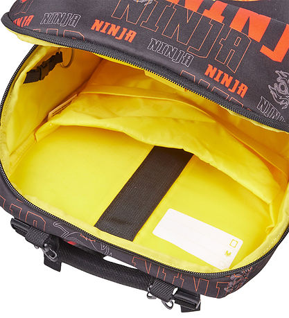The LEGO® Ninjago school backpack opens at the top with a double zipper. Inside there is a quilted pocket for a laptop or tablet and a large Rum with a key loop and elastic straps to keep track of the contents of the school bag. At the top there is a little zipper pocket for small items. The inside is lined with yellow textile.