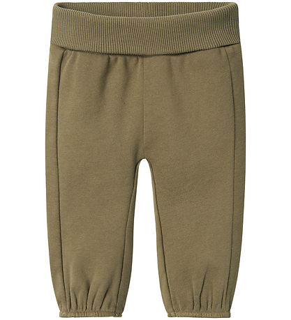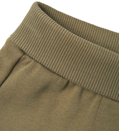 Comfortable Lil' Atelier sweatpants in an olive green colour with an elastic, ribbed waist. The sweatpants also have smart elastics at the legs, which adds a modern touch to the simple design.