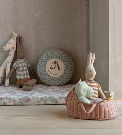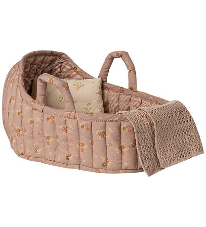 Charming Maileg baby lift in a warm pink with a floral print. The Maileg baby lift's has practical handles that make transportation easy, and it also comes with a nice cushion and a soft blanket. A cozy detail for doll play.