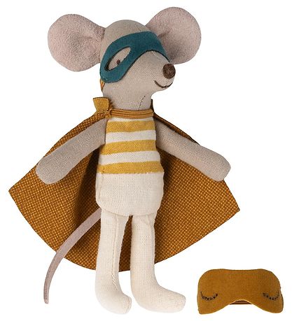 Funny Maileg soft toy shaped like a beige mouse with yellow stripes, a superhero cape in gold with glitter, a blue superhero mask and a yellow sleeping mask.