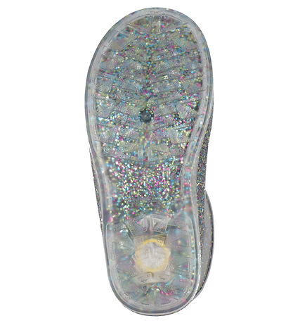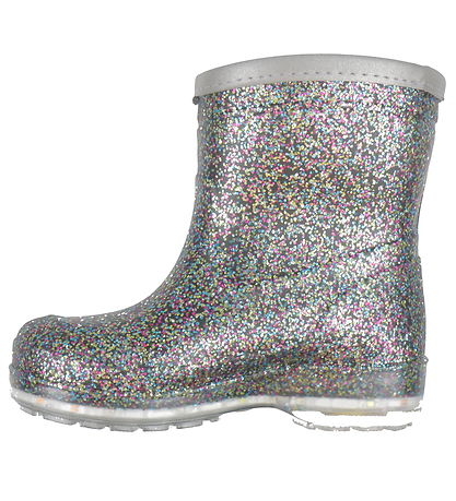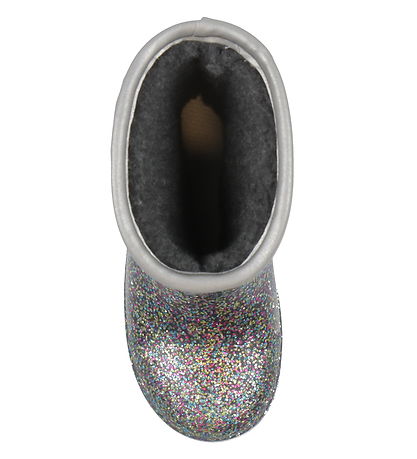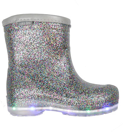 Cool Mikk-Line thermo boots with multicolour glitter and with a silver-colored edge on the shaft and transparent outer soles. As a smart detail, there are colorful lights all the way along the outer soles, which flash when the kid walks or runs.