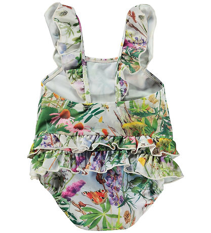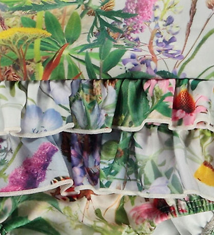 Beautiful Molo swimsuit with a colorful floral print. The Swimsuit has a round neckline and narrow shoulder straps with ruffle details at the shoulders. There are ruffles At the waist and elastic in the leg openings, which ensures a good fit.