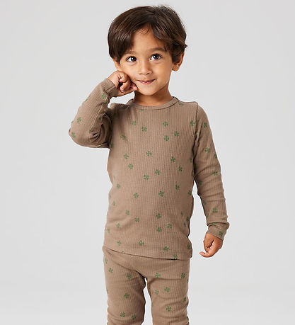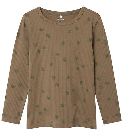 Beautiful Name It blouse in a beautiful walnut colour with a pattern of small, green four-leaf clovers all over.