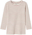 Elegant Name It blouse in off white with narrow, horizontal stripes in dusty olive green. The Blouse has a lovely ribbed structure and a tight fit. The Blouse has a round neckline and long sleeves.