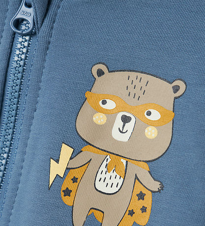 Beautiful Name It cardigan in a light blue shade with a colourful bear illustration on the front. The Cardigan has long sleeves and a zipper, which makes it practical and comfortable for the little ones.