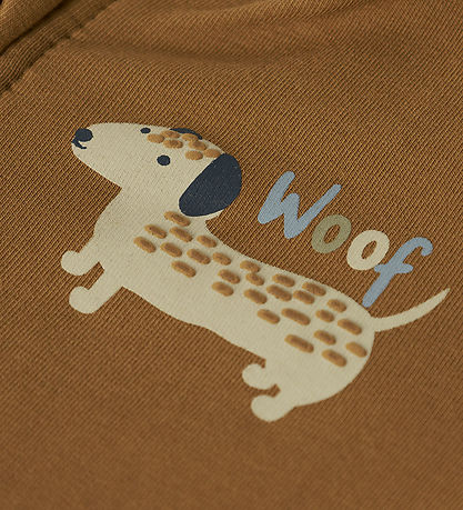 Charming Name It cardigan in a warm brown shade with a cute dog motif and the text "Woof" on the chest. The Cardigan has long sleeves and a practical zipper at the front. The Name It design includes ribbed edges at the throat, wrists and waist, which ensures a classic and stylish look.