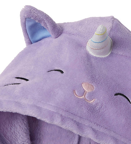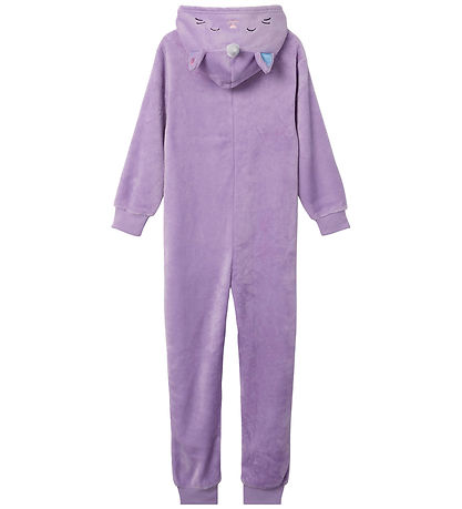 Beautiful Name It jumpsuit in a nice purple plys with an embroidery of the caticorn Squishmallow Cienna on the left chest. The hood is decorated with cute ears and horn and at the front it is adorned with a colorful rainbow pattern on the stomach in a circle.