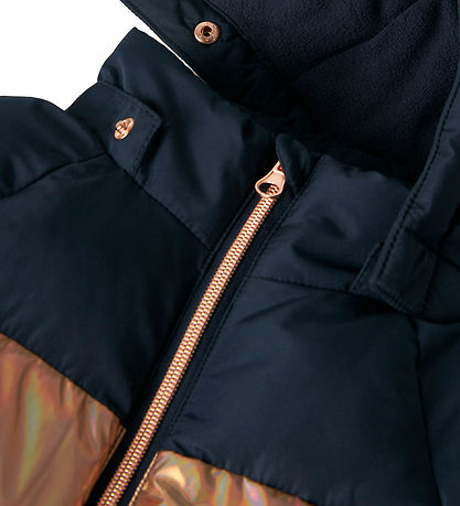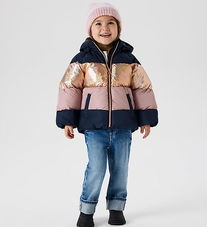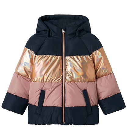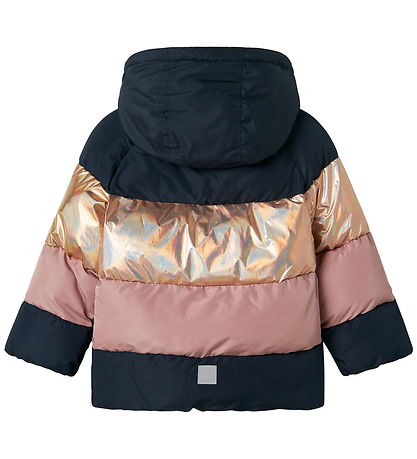 Lovely Name It puffer jacket with wide stripes in navy blue, pink and shiny gold. The duvet jacket has horizontal seams.