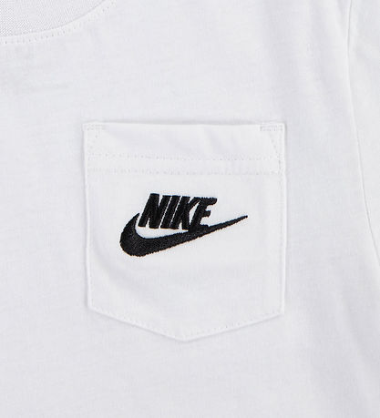 The Nike t-shirt has short sleeves and a round neckline. The Sweat shorts have a wide elastic edge at the waist and a flap pocket on each side.