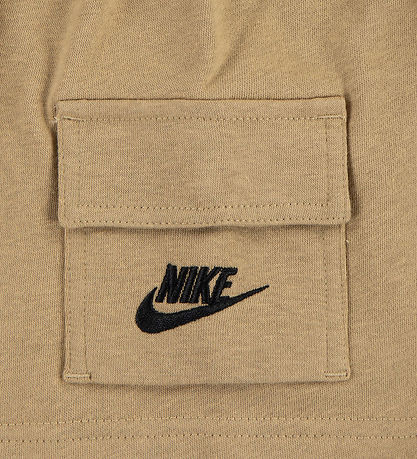 Nice Nike shorts set consisting of a white t-shirt and a pair of sweat shorts in a dark, beige shade. The T-shirt and sweat shorts are decorated with a logo print in black.