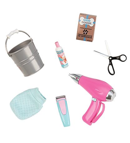 The Set includes a hair dryer with sound, a shaver. scissors, shampoo, brush glove and bucket.
