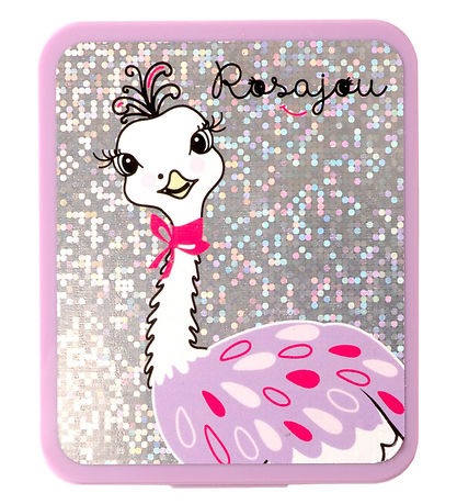 Beautiful Rosajou eyeshadows in pink, yellow, purple and green in a smart little box in pink with a practical mirror on the inside.