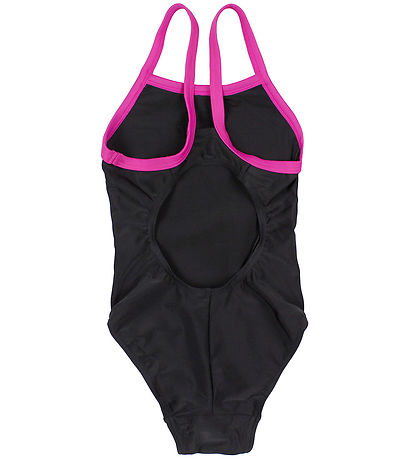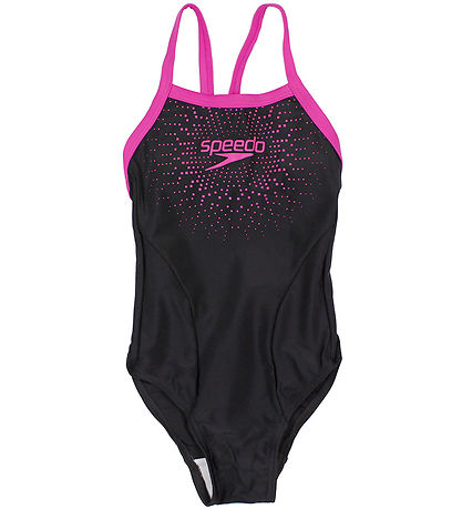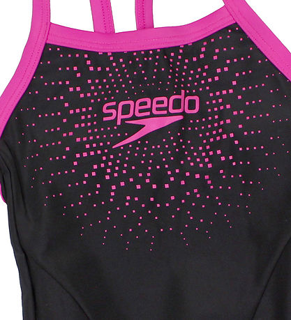 Nice Speedo swimsuit in black with pink edges at the top, and on the front there is a pink print of a smart pattern of small squares and the name "Speedo".