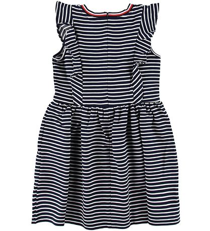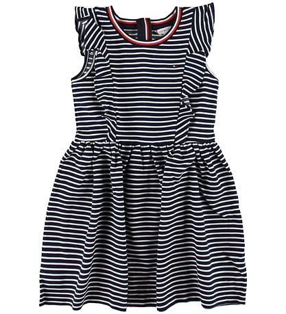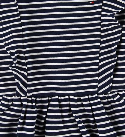 Fine Tommy Hilfiger dress with narrow, horizontal stripes in white and navy. In the neck opening, there are narrow stripes in navy, red and white, and in front, there is an embroidered small logo.