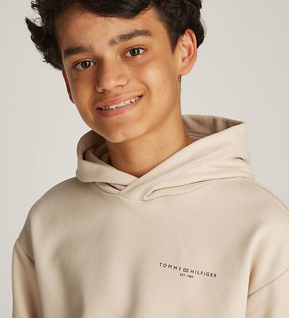 Smart Tommy Hilfiger hoodie in a soft beige shade with the brand's name printed on the chest. The Hoodie has a sewn-in hood and a classic kangaroo pocket on the front. It has long sleeves and ribbed edges at the sleeve and waist opening. The Hoodie is made of a very soft quality.