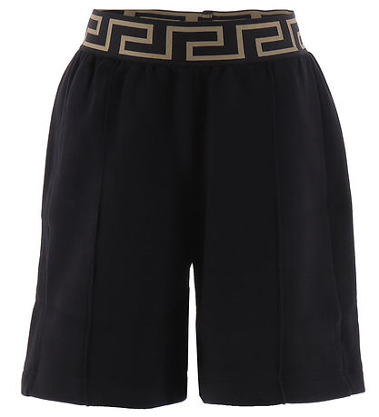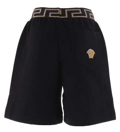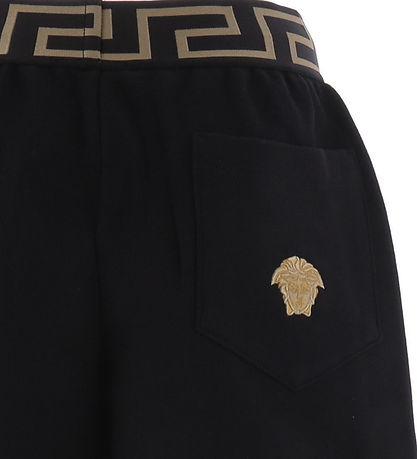 Smart Versace shorts in black sweat, and along the edge at the waist there is a gold-colored meander border. On the back on the right side there is a little patch in shades of yellow and shaped like a Medusa head.