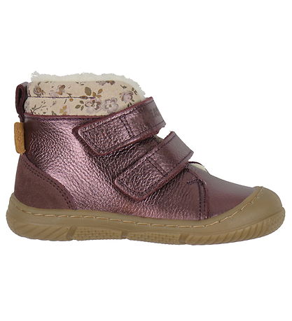 Beautiful Wheat winter boots in shiny purple leather with suede at the opening and heel. The heel collar is pink with a floral print in pink and purple.