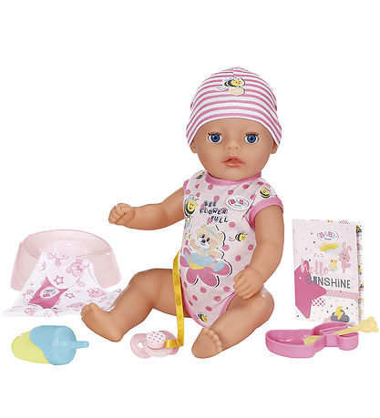 The Baby Born doll has a hard body and has various fun features. The Doll can drink water, pee in the nappy or the potty, and it can take a bath and the eyes open and close depending on whether the doll is sitting or lying down. All functions work without the use of batteries.