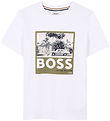 Beautiful BOSS t-shirt in white with horizontal stripes in beige shades and black.