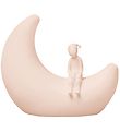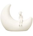 Cute Cam Cam Copenhagen lamp in off white, shaped like a halfmoon with a person wearing a beanie sitting on it.