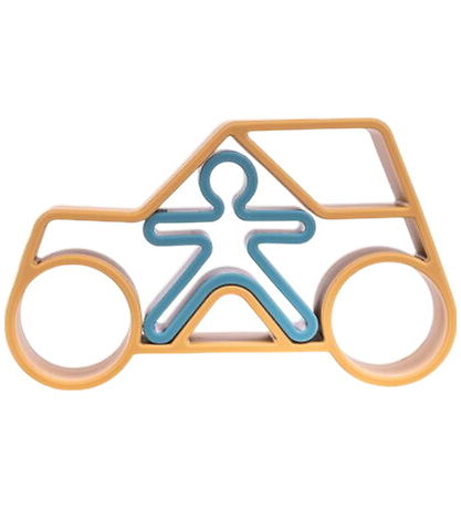 Smart Dëna teething toy, which consists of a brown car and a blue figure that fits into the car.