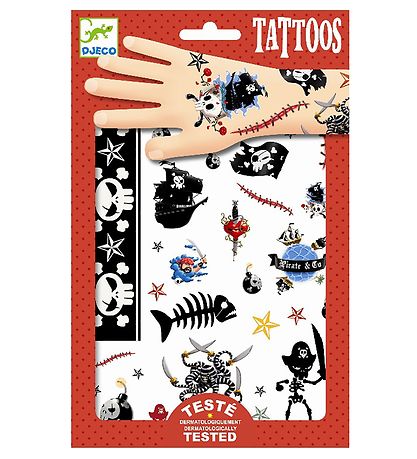 Cool Djeco tattoos with pirate-themed motifs in shades of black, blue and red.