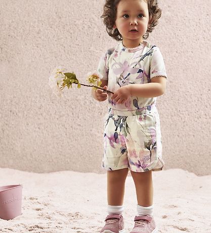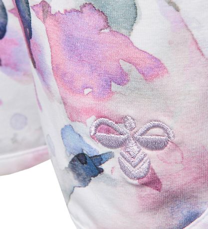 Nice Hummel shorts in ivory with an allover watercolour look in shades of blue, grey and rose, and an embroidered Hummel bee on the left thigh.