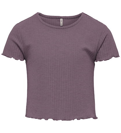 Elegant Kids Only t-shirt in a beautiful purple shade with a ribbed structure. The T-shirt is a card model with a round neckline and short sleeves. It has fine, wavy edges at the sleeve and waist opening.