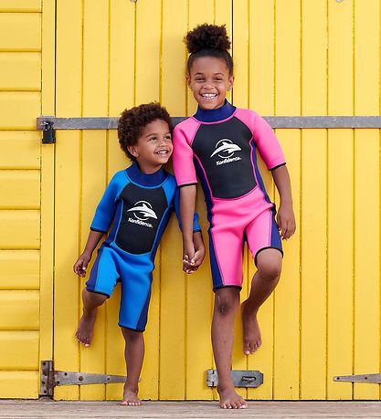 Wonderful Confidence wet suit in blue, navy blue and black with Confidence's well-known dolphin logo on the chest. The wet suit is made of soft and comfortable neoprene, which is a flexible material that also protects 100% from the sun's UV radiation, while keeping your child warm both in and out of the water.