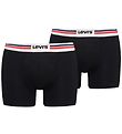 Cool Levis boxers sold in a 2-Pack, both pair in black with a white edge at the waist, with a red and blue stripe that goes all the way around and on the front it says "Levis" in black.