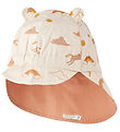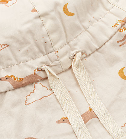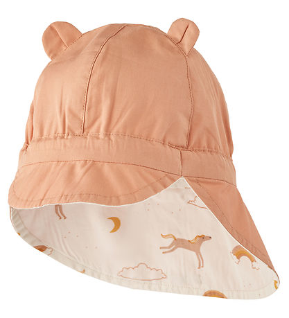 Beautiful Liewood legionnaire hat in beige with cute print of rainbows, pony riding and clouds. It is reversible, and on the inside it is plain beige, and on top there are two cute ears.
