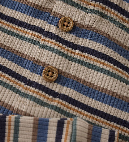 Practical trousers from Minymo with a nice striped pattern in shades of blue, beige, orange and brown. The Minymo trousers have a good fit with elastic edges at the ankles, ensuring a tight fit. The Trousers have a ribbed structure, which gives a modern twist to the timeless design.