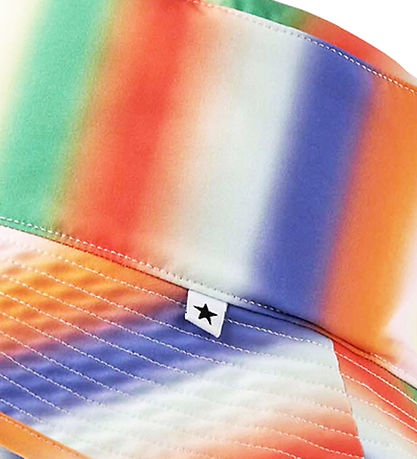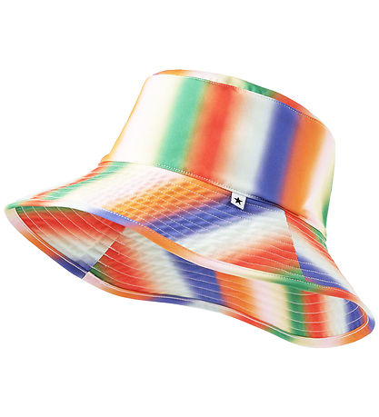 Beautiful Molo swim hat with multicoloured stripes. The Swim hats has a wide brim all the way around.